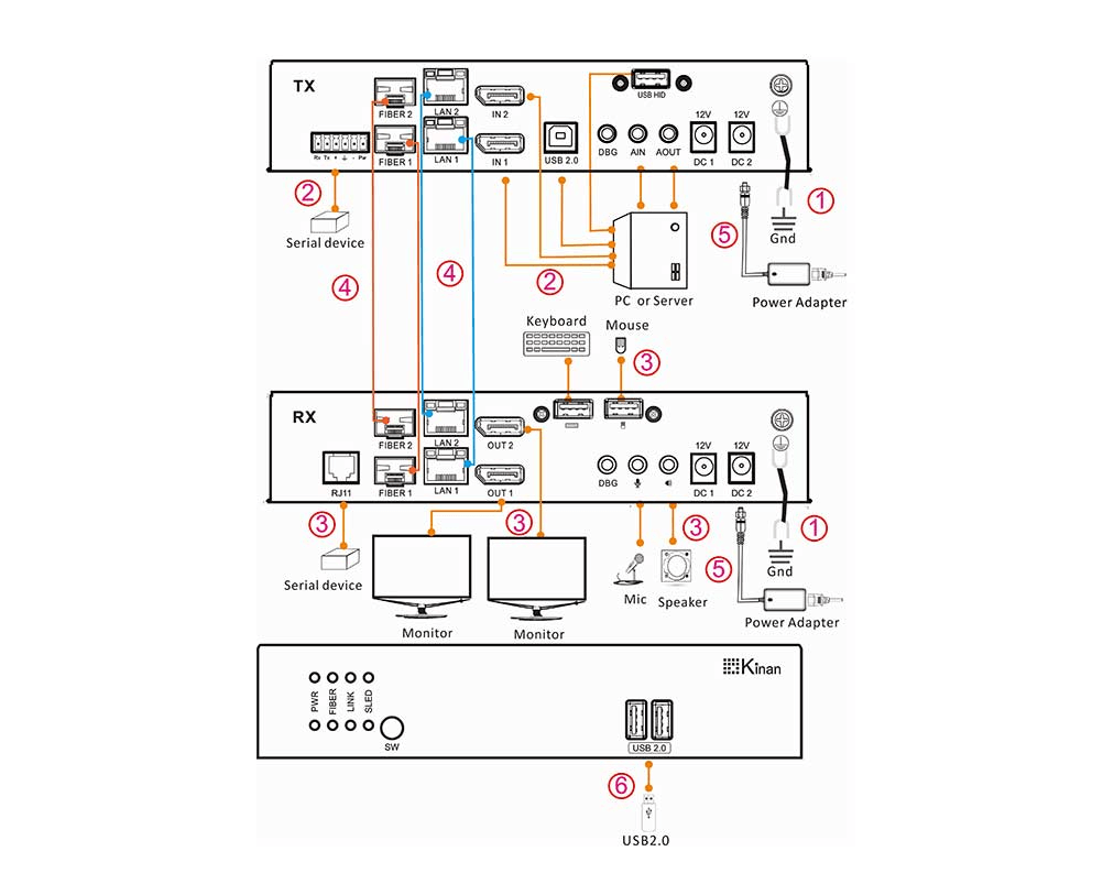 Для реализации таких задач Kinan предлагает специализированные матричные IP KVM удлинители (например, KFP286K-RX + KFP286K-TX).