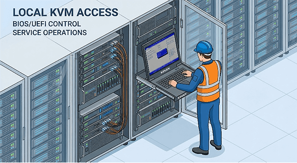 Управление на уровне BIOS/UEFI и сервисные операции. Для эксплуатационных служб критично иметь возможность выполнять операции ниже уровня ОС: вход в BIOS/UEFI, изменение параметров загрузки, настройка контроллеров, управление режимами питания, работа с консолью на ранних этапах загрузки. KVM обеспечивает такой доступ нативно: сервер воспринимает консоль как физически подключенную периферию.