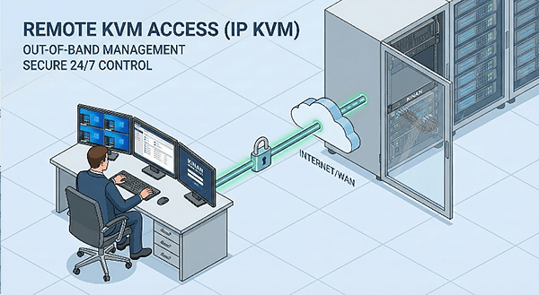 Удалённый доступ и управление вне зависимости от состояния ОС. Для крупных ЦОД и распределённых площадок часто требуется не только локальная консоль в машинном зале, но и удалённый доступ. Это реализуется через IP KVM (KVM over IP), когда видеосигнал и устройства ввода транслируются по сети Ethernet. Ключевая ценность IP KVM - “out-of-band” доступ, то есть можно управлять сервером, даже если ОС не загрузилась, “упала” сеть, или не работают агенты удалённого доступа. В аварийных сценариях это часто единственный быстрый способ вернуть систему в строй без выезда персонала.
