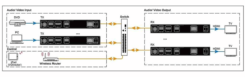 Компания Kinan представляет новую модель AV удлинителя через IP — KEH1MS. Эта система состоит из передатчика (TX) и приёмника (RX), и обеспечивает передачу аудио-видео сигнала в формате до 4K@30 Гц с использованием компрессии H.265. Модель полностью совместима с обычными управляемыми и неуправляемыми сетевыми коммутаторами. Управление устройством возможно через приложение «VDirector» на планшете, смартфоне или Windows PC.